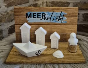 Sag es mit dieser tollen Deko auf Eiche-Klötzchen mit schönen maritimen Elementen. Das Highlight ist die süße Möwe auf einem Poller…🛟