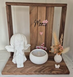 Ein süßer Engel ,auf Nussbaumklötzchen, mit einem Teelicht und einer Vase mit Trockenblumen, dekoriert. Ein Schmetterling darf nicht fehlen.