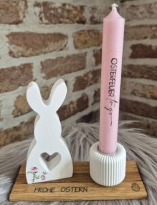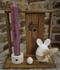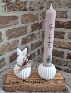 Der tolle Halter aus Eiche-Klötzchen, ist mit einem süßen Hasen, mit Trockenblumen, einer Kerze und einem Ei dekoriert. 😊