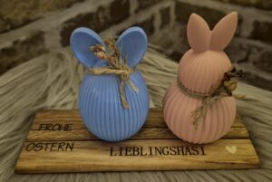 Die süßen Hasen ,in blau und rosa, sind aus Gießpulver, auf Eiche-Klötzchen.
